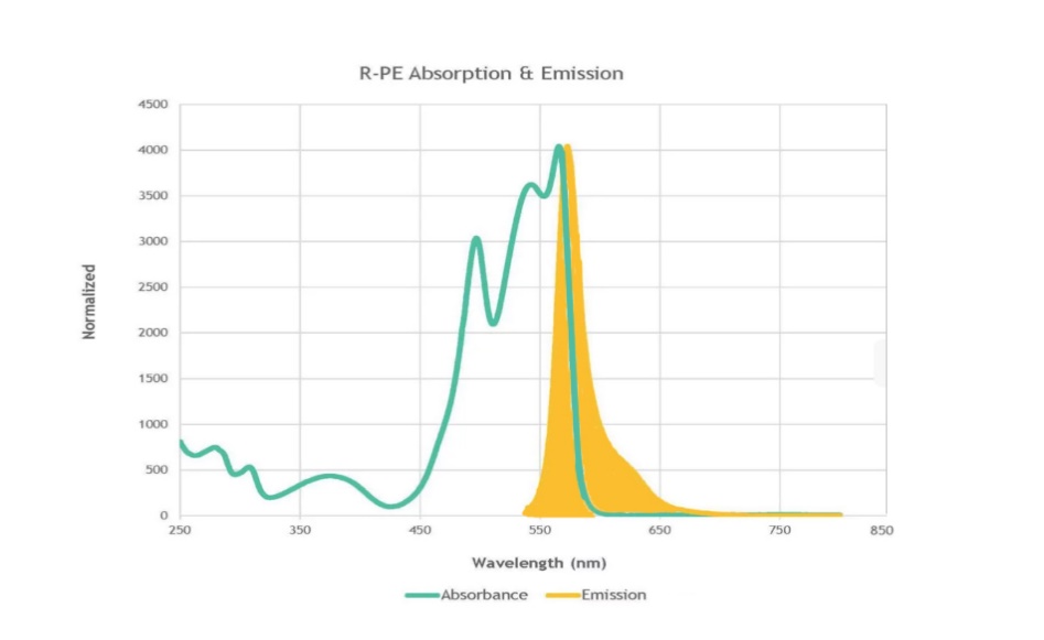 藻红蛋白(R-phycoerythrin ,R-PE)是从红藻中分离提纯的一种荧光蛋白,最大激发波长为565nm,最大荧光发射峰为575nm。,由于其吸光度和荧光量产率很高,荧光强而稳定,灵敏度高备受免疫检测标记领域青睐。R-PE蛋白的亚基组成为(αβ)6γ,每个α、β亚基分子量为20KDa,每个γ亚基分子量为30KDa,总分子量为240kDa。目前还没有办法通过重组蛋白表达量产,只能从红藻中提取,因此其生产成本制约其广泛使用。