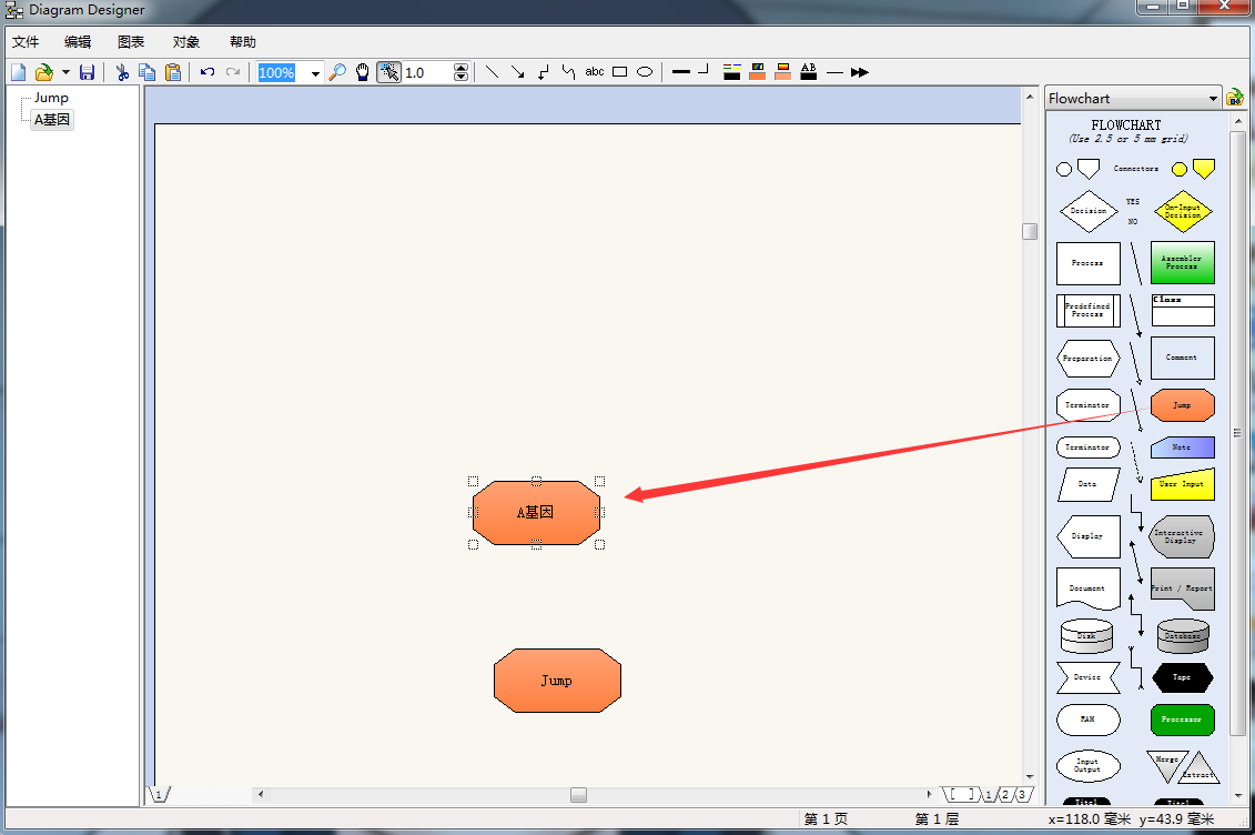 3.图形插入,鼠标左键拖动目标形状到左边的白色编辑区,释放鼠标