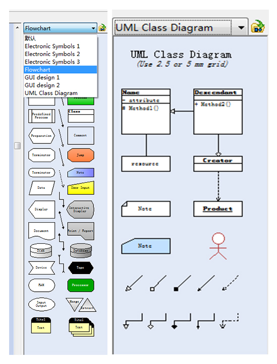 2.默认工具为“Flowchart”,也可从右上角下拉菜单中选择更多工具。软件上方也有一些常用工具