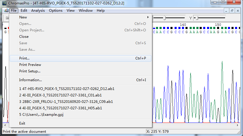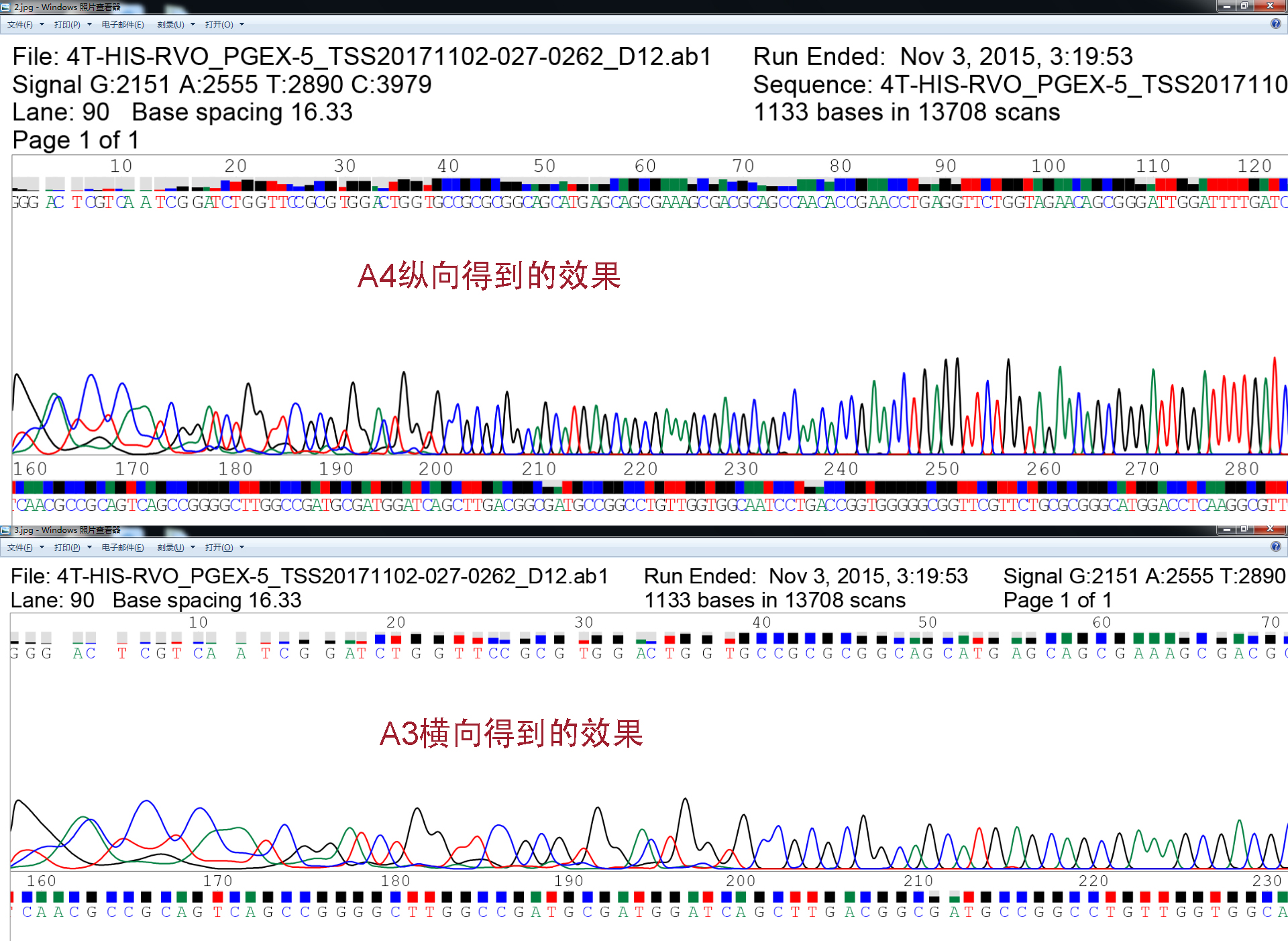 5. 此时得到的图片有4M多,如果得到的图片碱基峰图之间显得很拥挤怎么办,没事,接下来在告诉你一个小诀窍。第2步打印选项这里点击Properties进入打印选项设置。布局--横向--设置纸张大小(本次选择A3)--确定,得到PDF文件后其它步骤不变