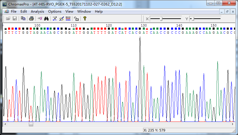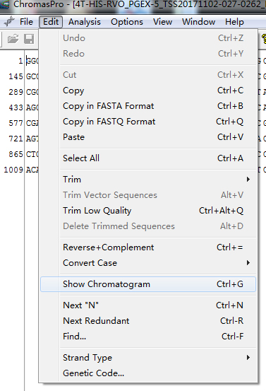 1.使用Chromas Pro打开测序公司给的文测序文件“*.ab1”,如果显示的是碱基序列,则按一下操作Edit--Show Chromtogram,显示峰图