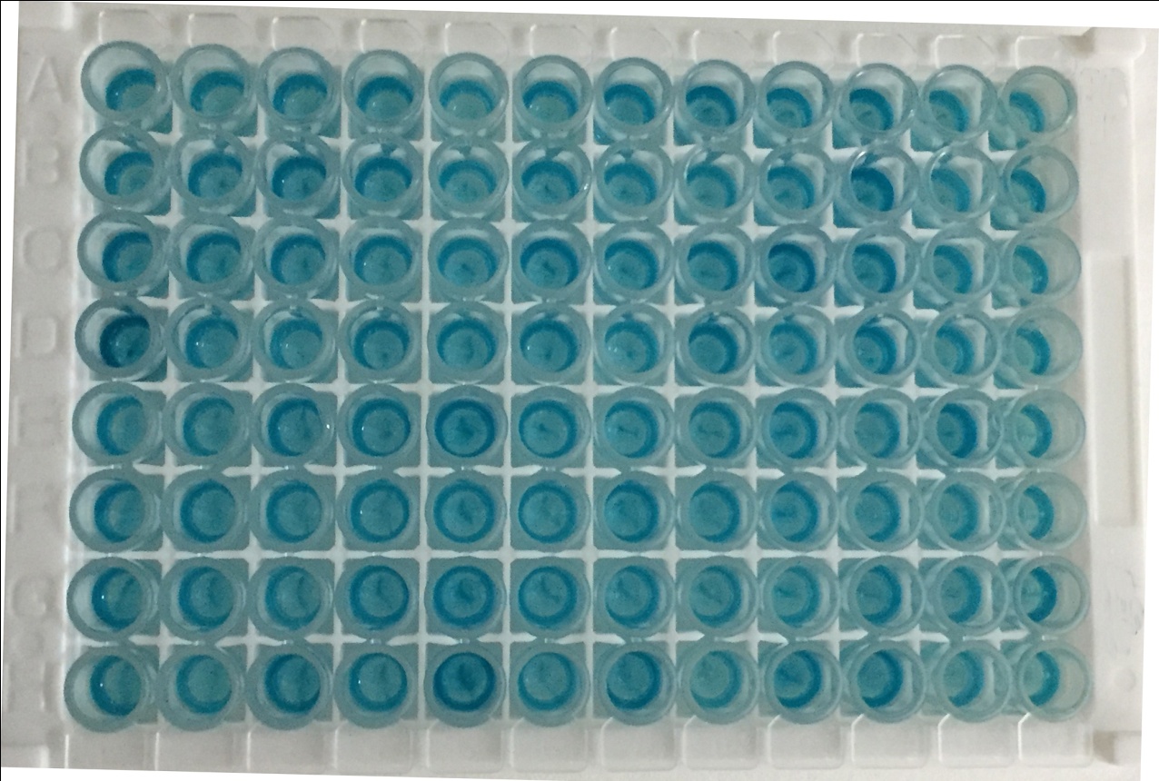 我们返回去找原因,发现空白对照(不加待筛选单抗的细胞培养液上清)也是蓝色的,这个筛选检测实验显然是无效的,上述实验中涉及到两个二抗(一个是包被在酶标板上的羊抗小鼠二抗,一个是羊抗兔HRP标记二抗),任何一个二抗出现非特异性结合问题,整个实验体系都会出现“短路”,造成上图结果。
