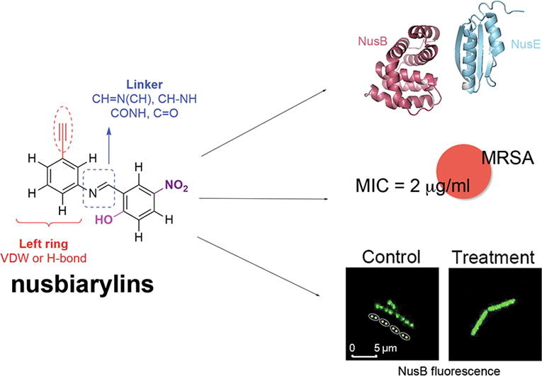 Qiu Y , Chan ST , Lin L,Nusbiarylins, a new class of antimicrobial agents: Rational design of bacterial transcription inhibitors targeting the interaction between the NusB and NusE proteins.Bioorg Chem. 2019 Nov;92:103203.