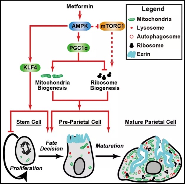 在类器官上的进一步实验,也证实了二甲双胍增加胃壁细胞数量,促进这些细胞成熟的效果,而且二甲双胍还能抑制胃上皮祖细胞的增殖。这种调节效果,主要与AMPK通路激活的下游转录因子Klf4和PGC1α有关。