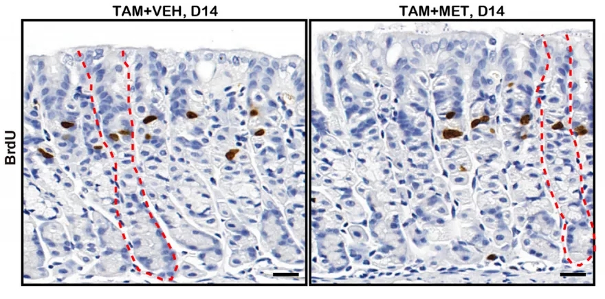 接下来,研究团队让小鼠服用了两个星期的二甲双胍,发现胃壁细胞的数量会迅速上升,即使用他莫昔芬处理,杀死绝大多数的胃壁细胞后,二甲双胍也能促进干细胞分化成胃壁细胞,使胃壁细胞数量迅速恢复。